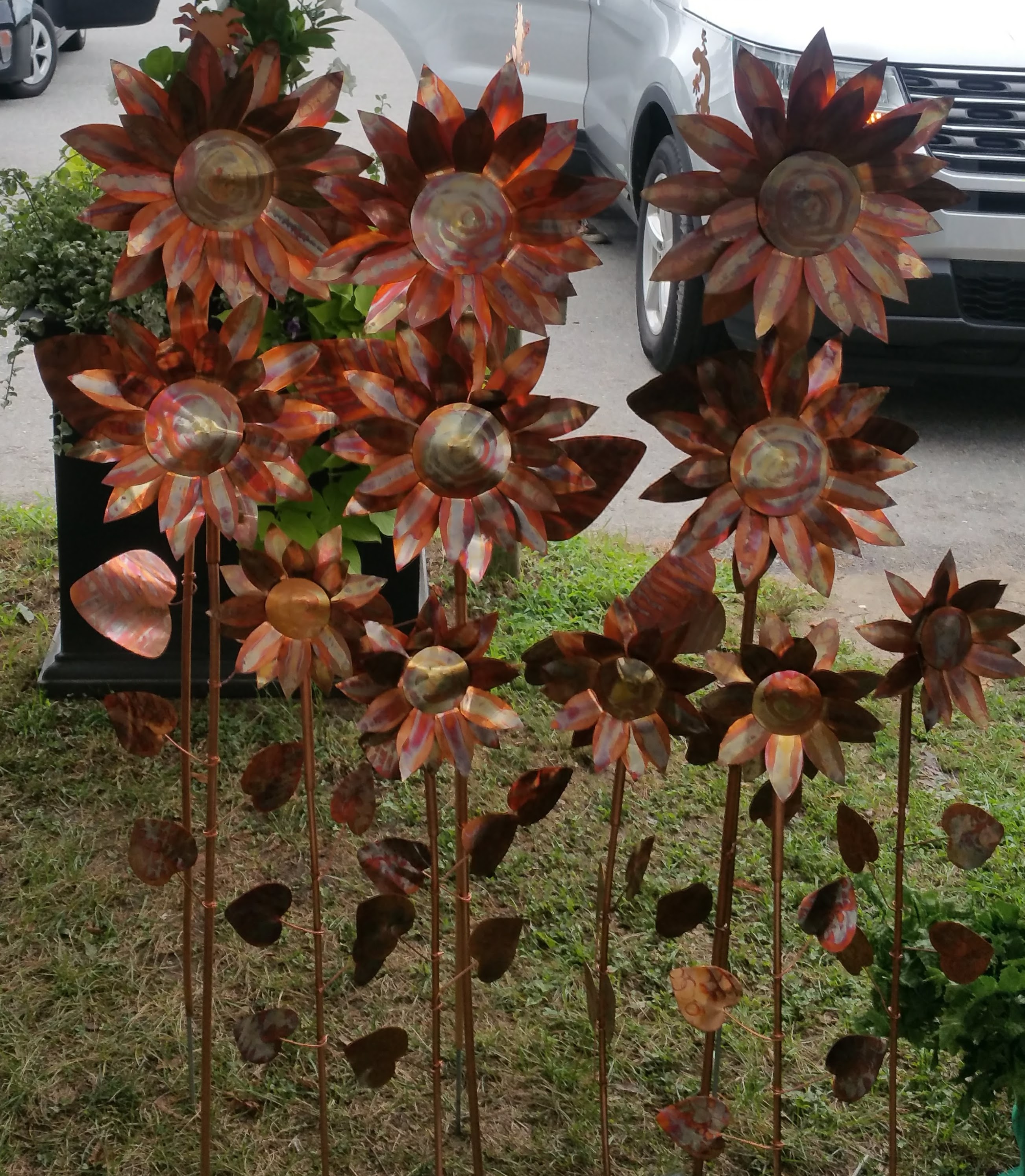 An incredible addition to any home or garden. Hand painted with fire to bring out the beauty of the copper, each one is unique, Our copper sunflowers come in 3 sizes: small 6" in diameter, each with copper leaves and stem, 30" high medium 9" in diameter, each with copper leaves and stem, 33" high large: 12" in diameter, each with copper leaves and stem, 36"high Each comes with an additional rod for support and additional height.